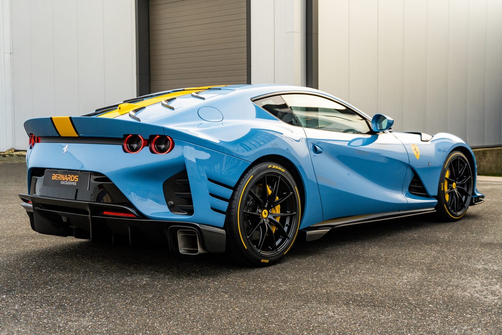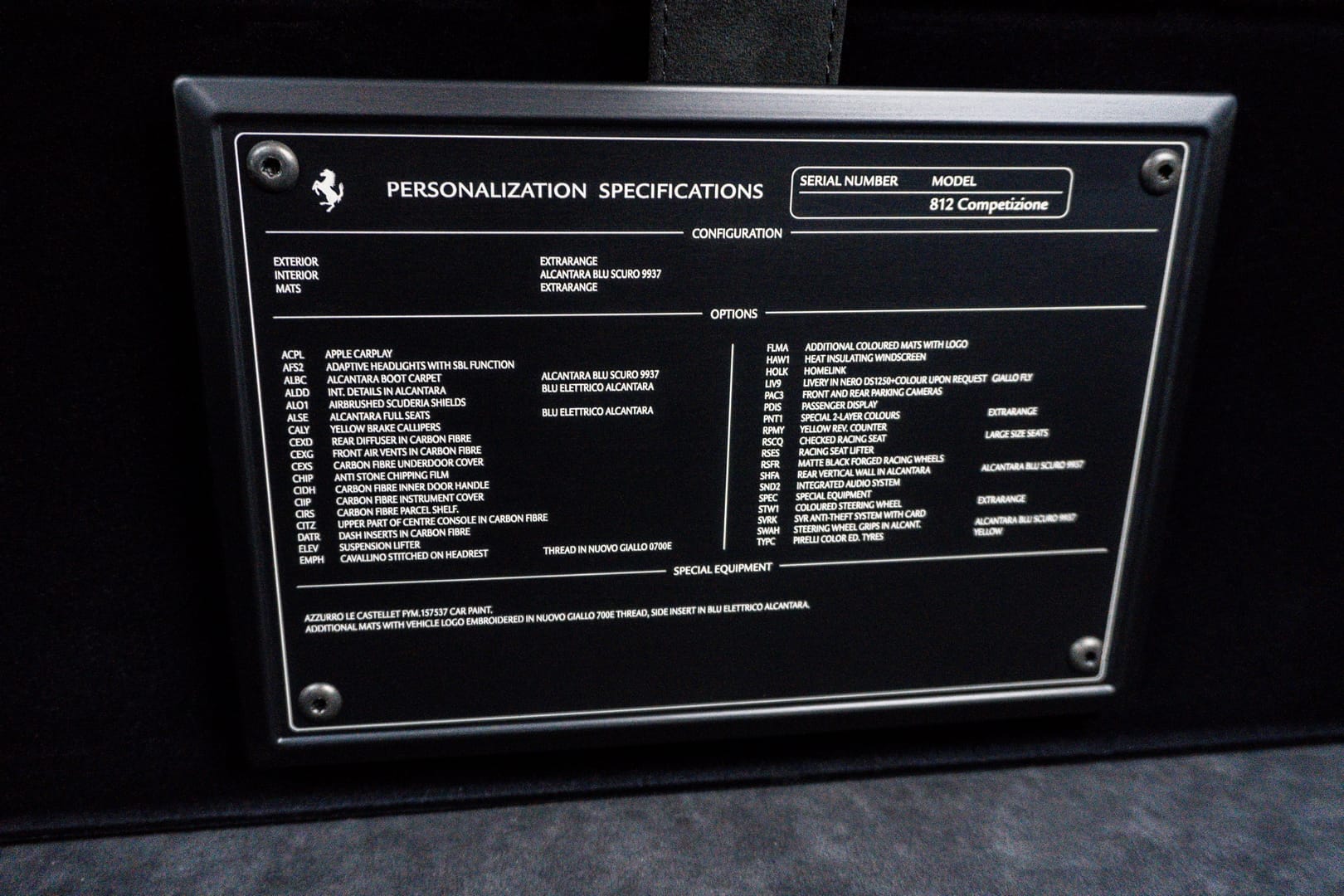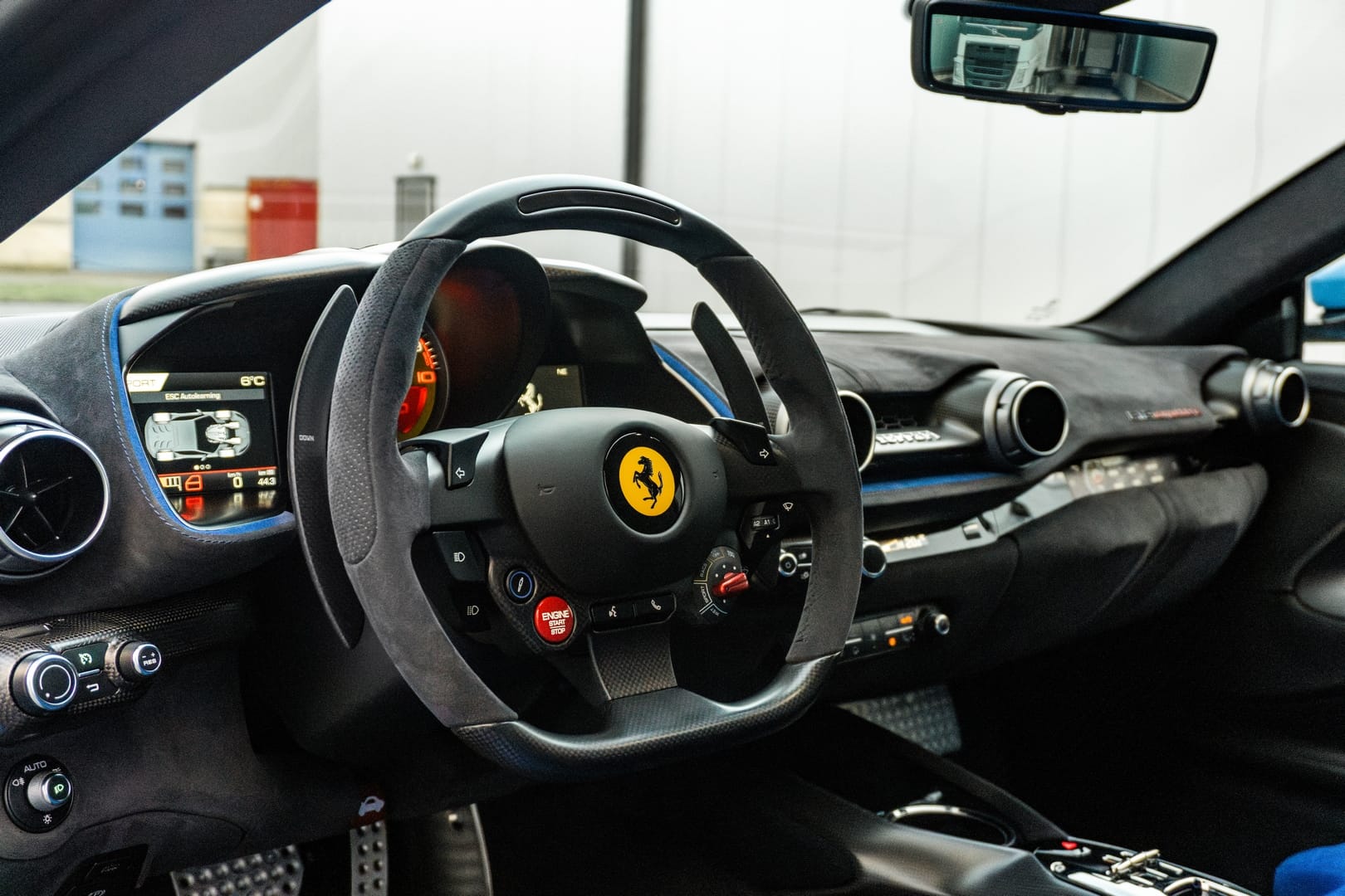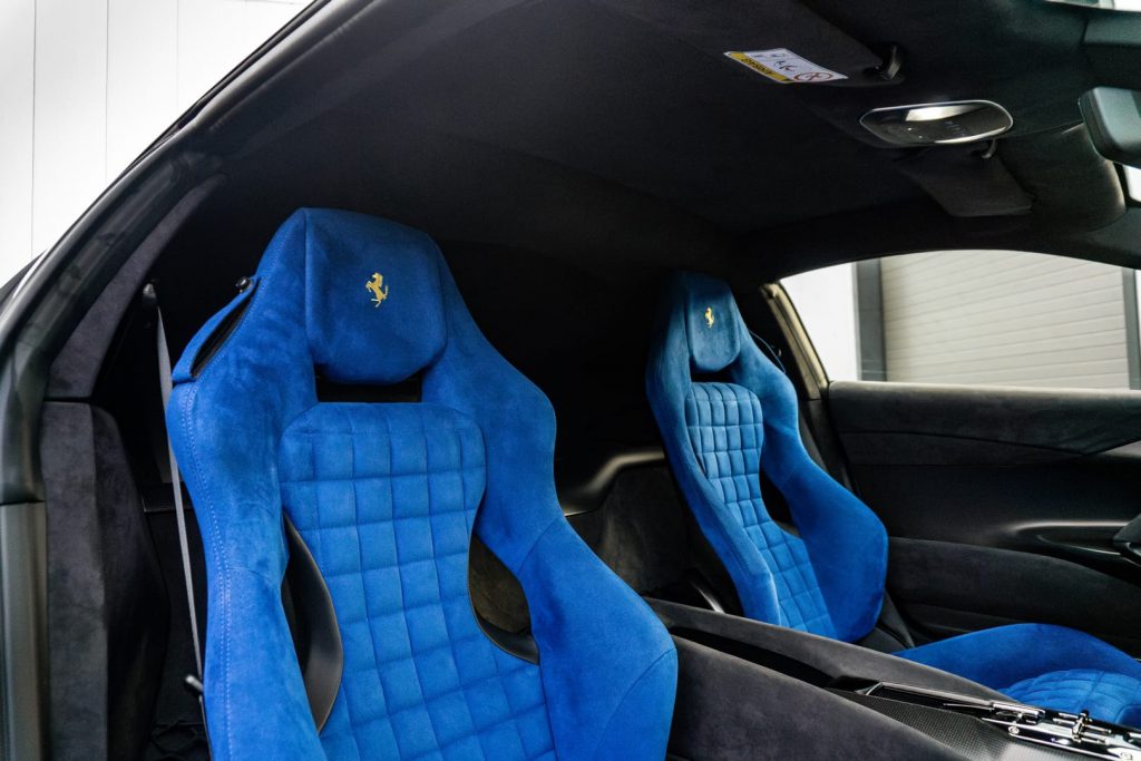 Het door ons aangeboden exemplaar heeft een prachtige configuratie in de kleur Azzurro Le Castellet en met de kenmerkende 812 strepen. Het ‘Blu Scuro’ alcantara interieur in combinatie met de ‘Blu Elettrico’ accenten en stiksels in het grijs en blauw brengen maken het interieur echt af. Dat dit niet de eerste Ferrari is die de eerste eigenaar samenstelde is wel duidelijk, alle carbon opties zijn aangevinkt en de interieur/exterieur configuratie zijn zonder zeker meer dan gelukt!